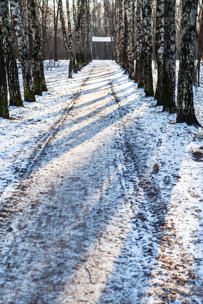 Аллея в березовой роще в зимний период