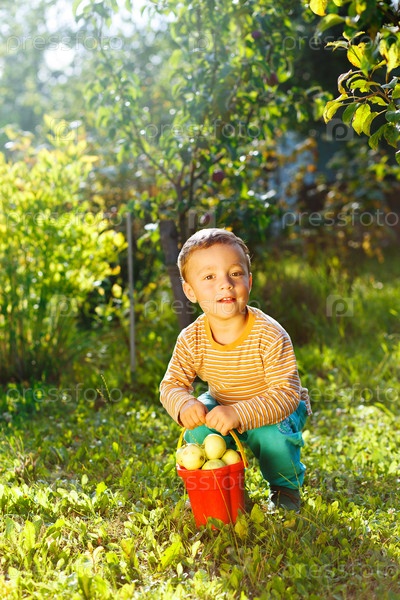 Милый маленький мальчик с ведром яблок