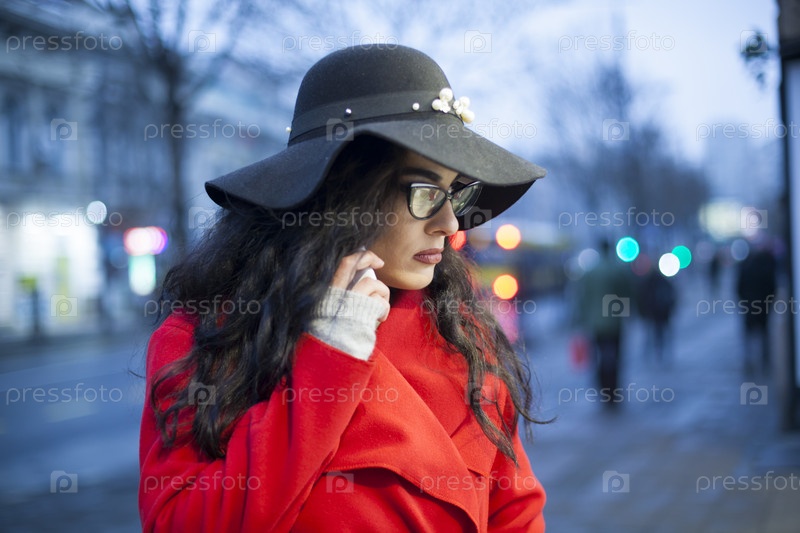 Женщина в красном пальто со смартфоном