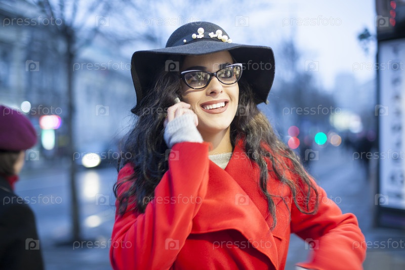 Девушка, одетая в красное пальто, разговаривает по телефону