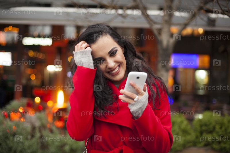 Девушка, одетая в красное пальто, разговаривает по телефону