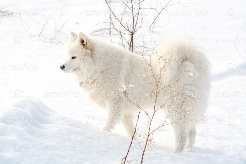 Белый Самоед собака на снегу