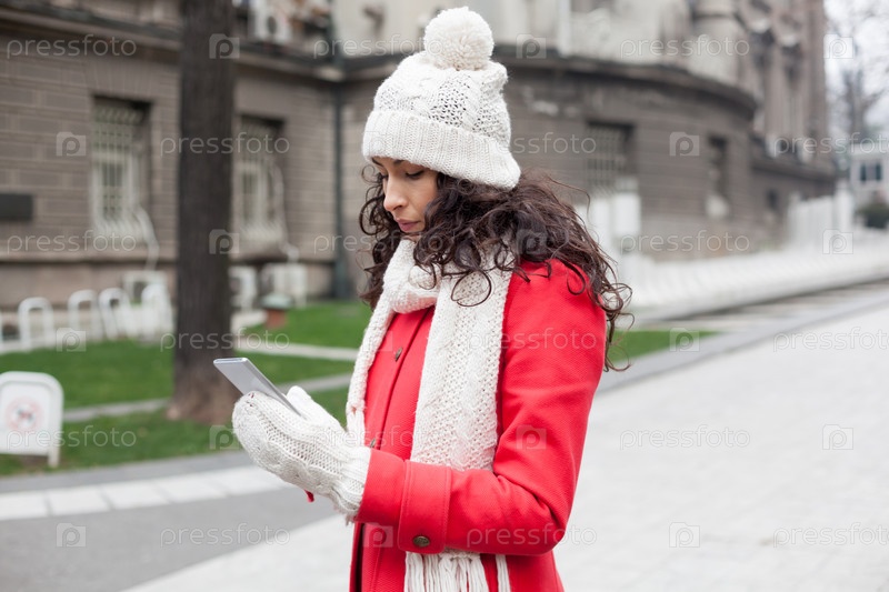 Красивая женщина в теплой одежде со смартфоном