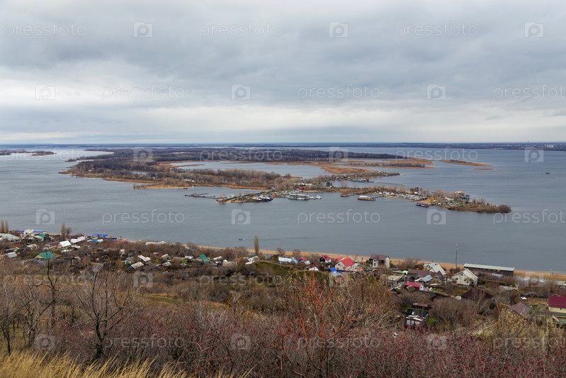 Саратов. Вид на зеленый остров на реке Волга. Россия