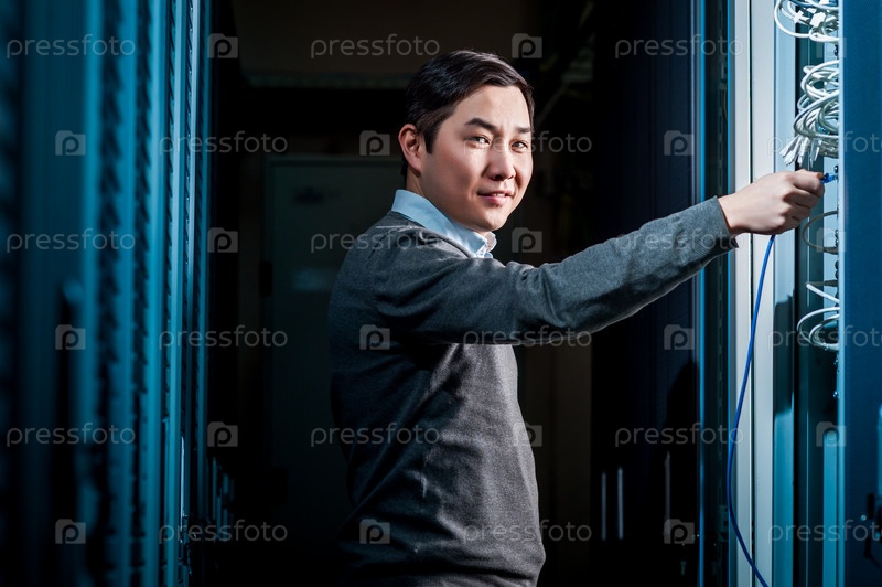 Молодой инженер в серверной комнате