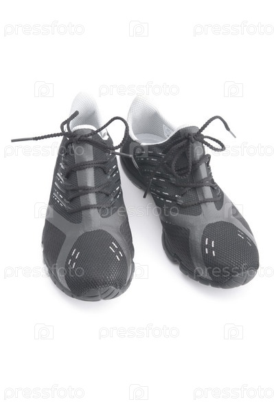Пара черных мужских кроссовок на белом фоне