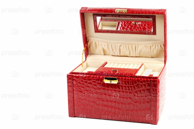 Красный кожаный сундучок для украшений на белом фоне