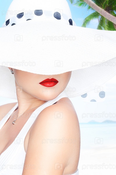Девушка в белой шляпе на пляже