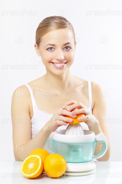 Девушка с соковыжималкой и апельсинами на сером фоне