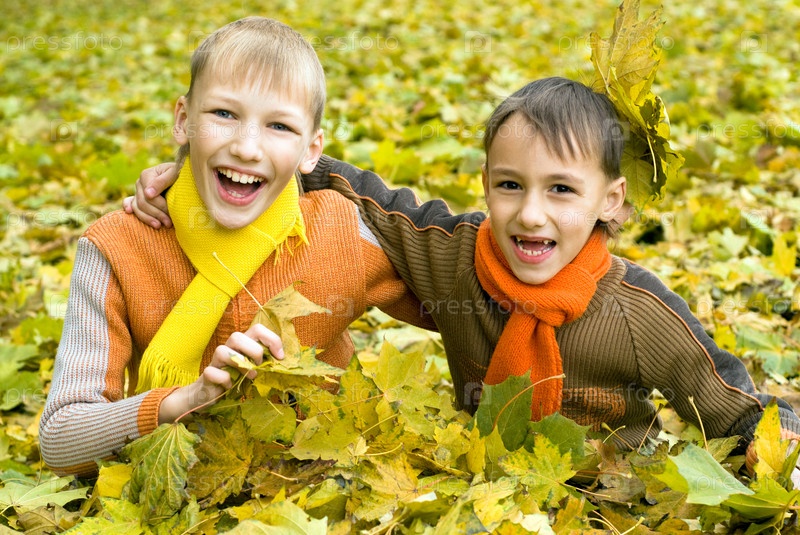 Смеющиеся мальчики играют в осенних листьях