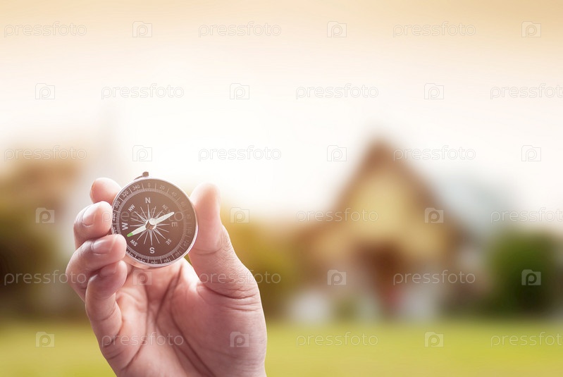 Компас в руке на размытом фоне