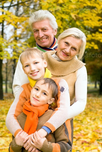 Бабушка и дедушка с внуками в осеннем парке