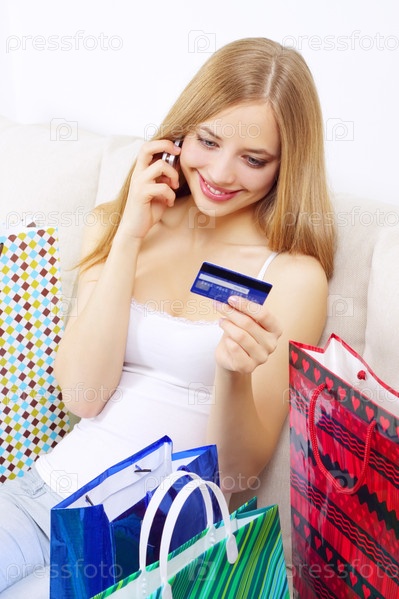 Девушка с кредитной картой говорит по телефону