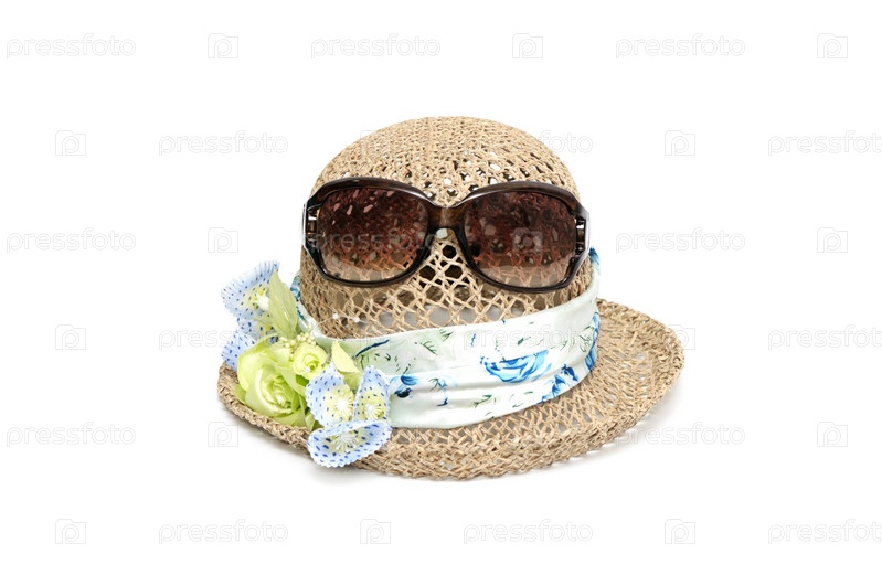 Женская шляпка и очки на белом фоне