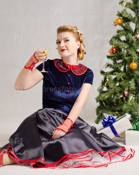 Женщина возле елки с коктейлем в руке