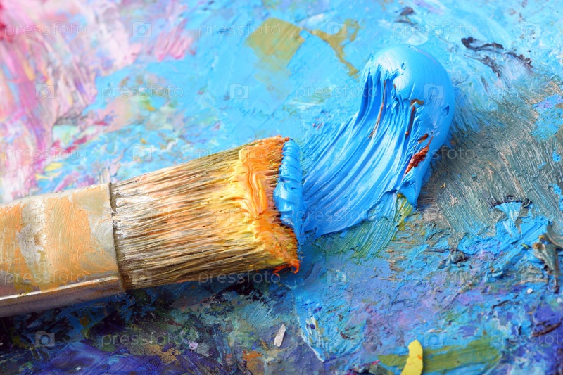 Художественная кисть на палитре с голубой краской
