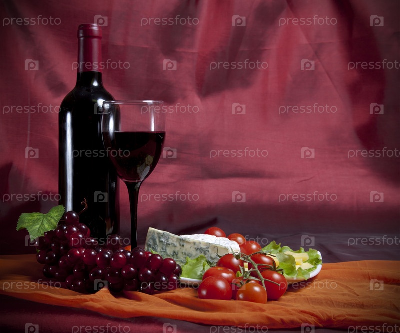 Бутылка вина, виноград, помидоры и сыр