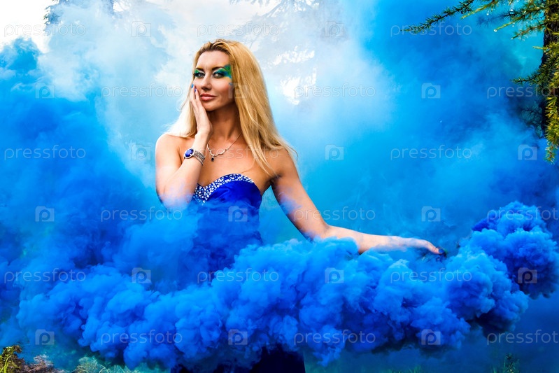 Красивая молодая женщина в облаке синего дыма