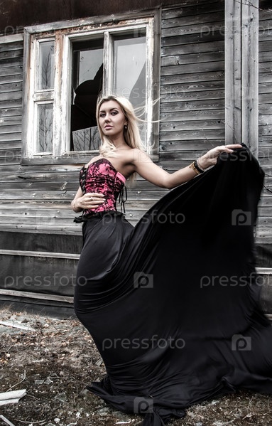 Женщина на фоне заброшенного дома