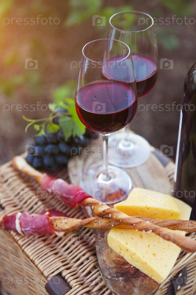 Два бокала красного вина с хлебом, мясом, виноградом и сыром