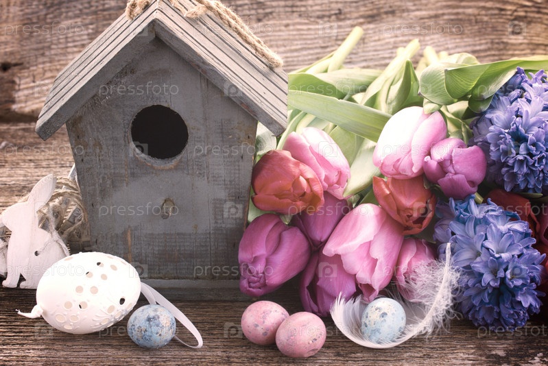 Пасхальные яйца и скворечник с тюльпанами