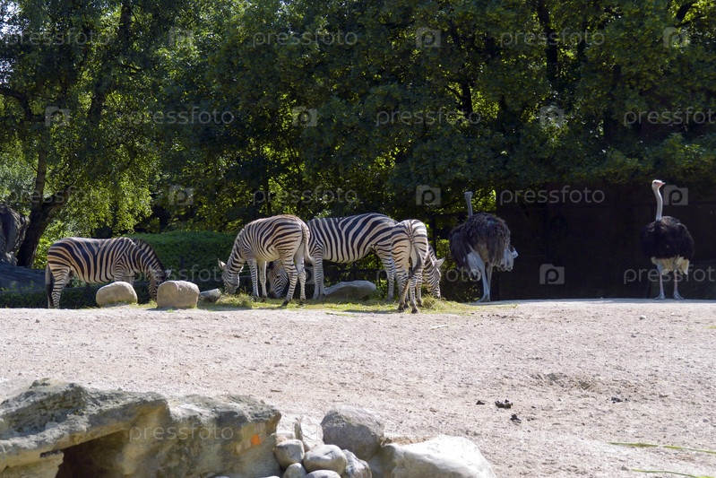 Зебры и страусы в зоопарке