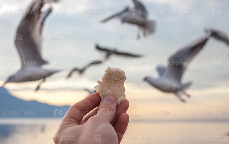 Рука с пищей для чаек