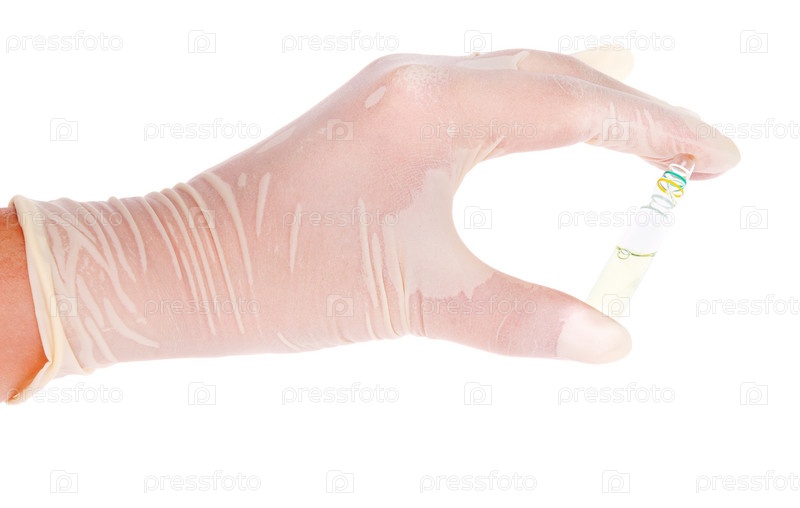 Рука в латексных перчатках с ампулой на белом фоне