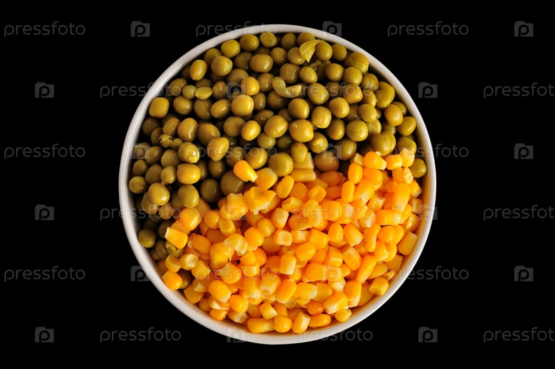 Кукуруза и горох в миске на черном фоне