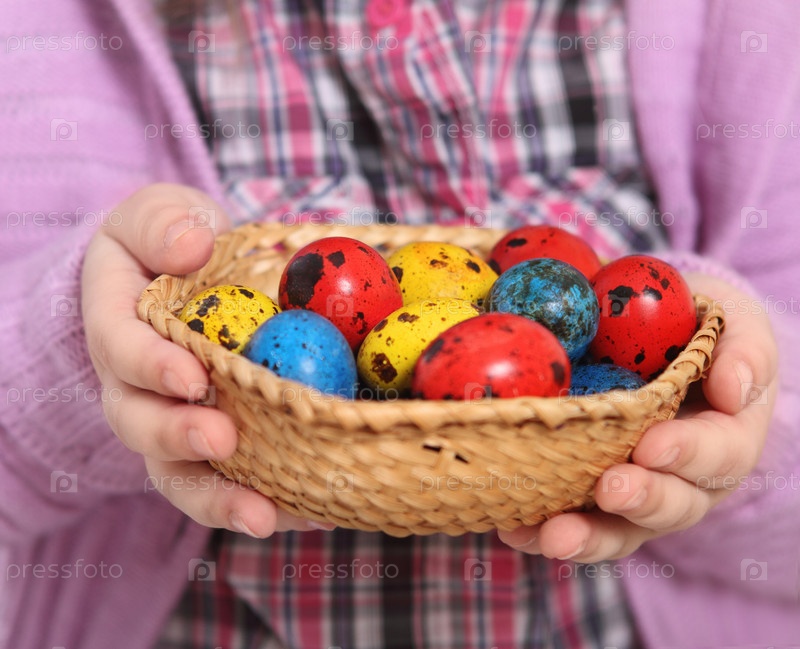 Ребенок держит корзину с пасхальными яйцами