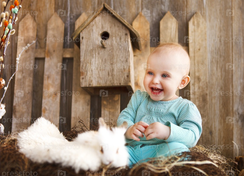 Счастливый ребенок играет с кроликом