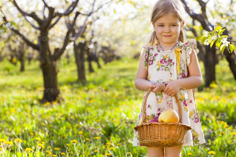Маленькая милая девочка с корзинкой яблок