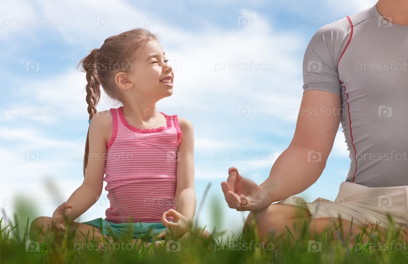 Отец с дочерью занимается йогой