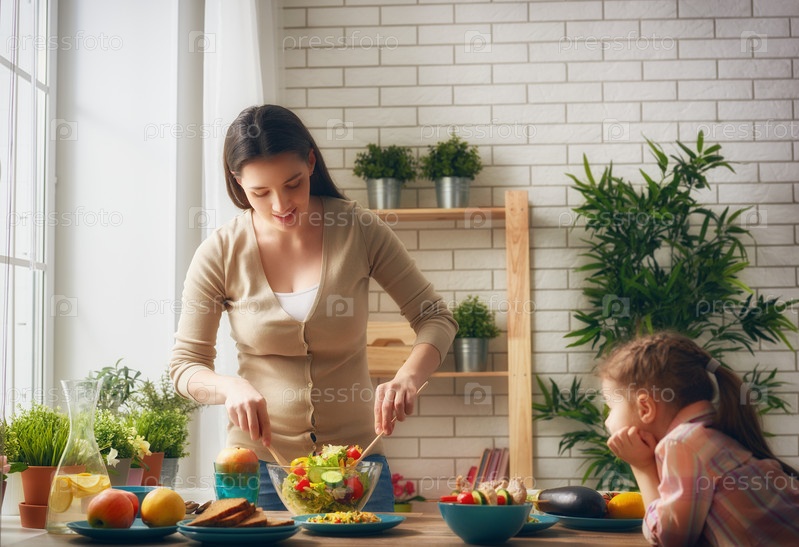 Мать и дочь готовят салат