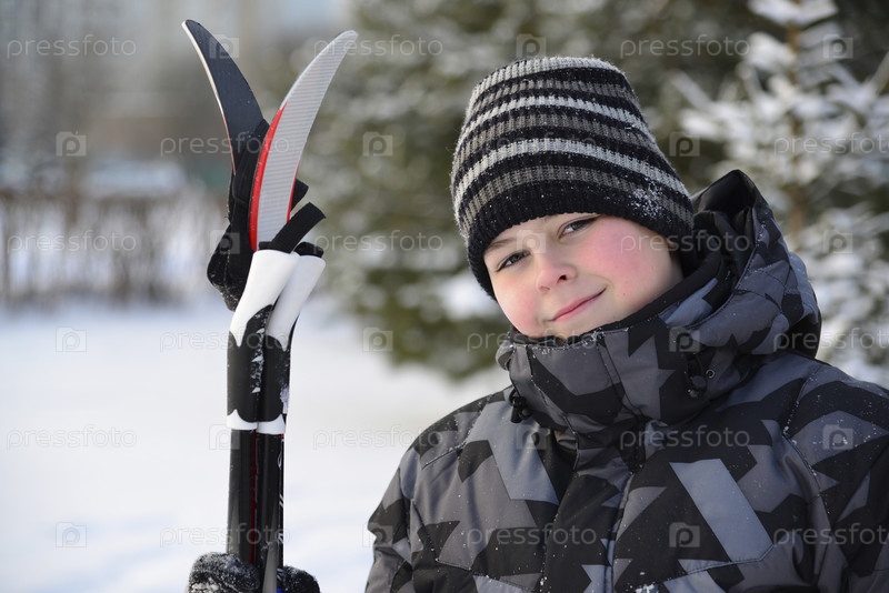 Мальчик в зимнем парке с лыжами