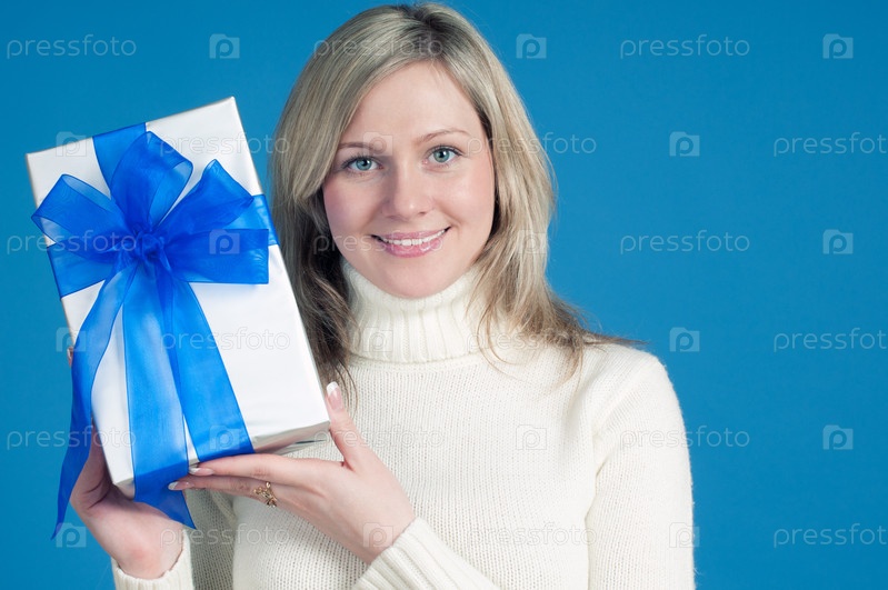 Улыбающаяся женщина с подарком, на синем фоне