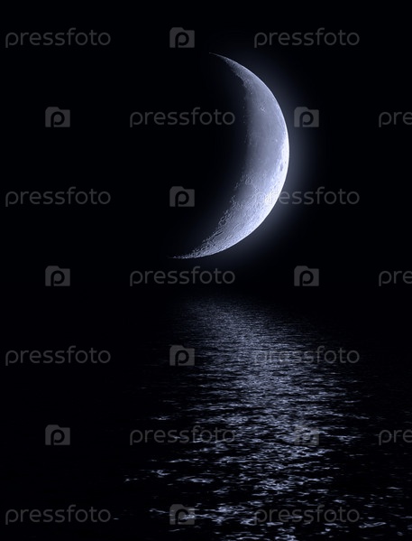 Половина луны в синем небе над водой