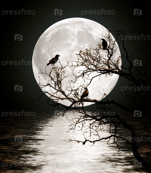 Вороны сидят на дереве на фоне луны