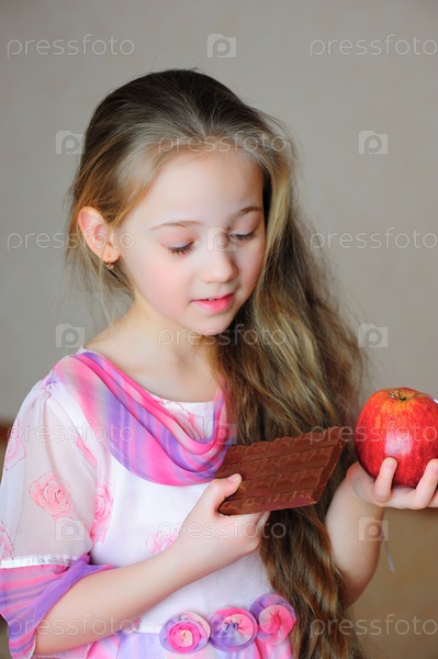 Девочка выбирает между яблоком и шоколадом