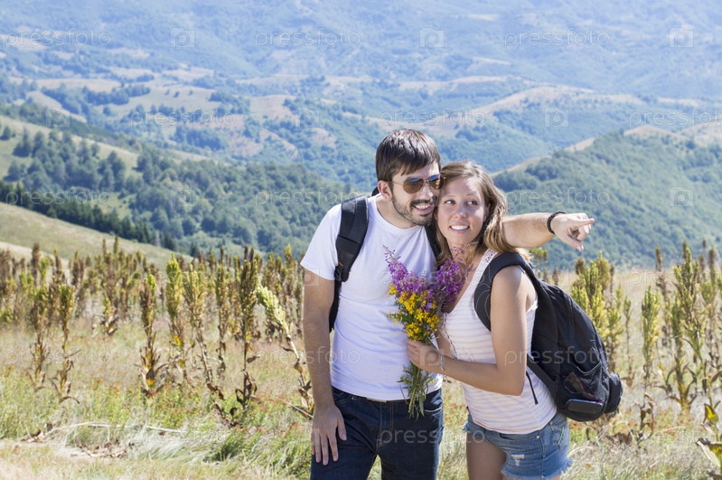 Пара туристов с рюкзаками на горе