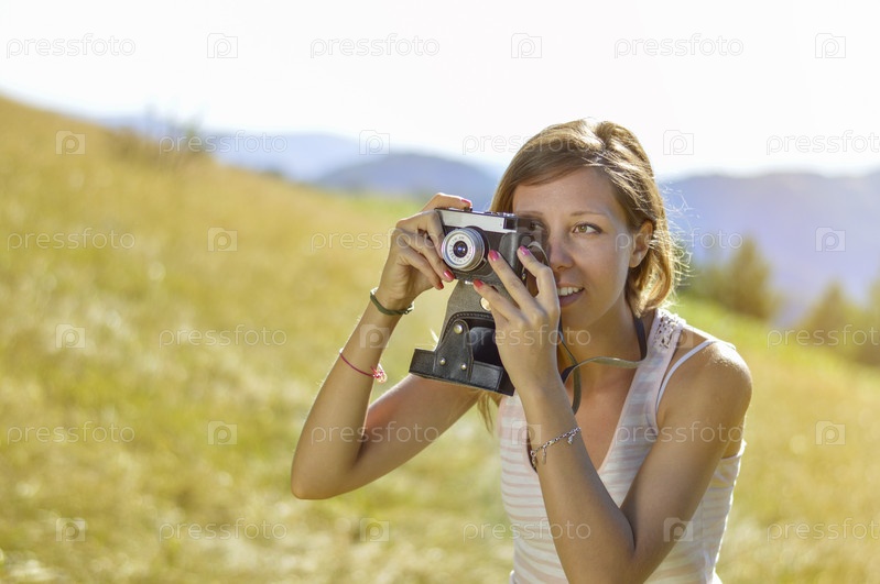 Молодая и красивая женщина с ретро камерой