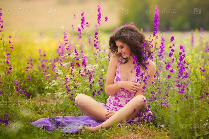 Красивая молодая женщина в фиолетовых цветах