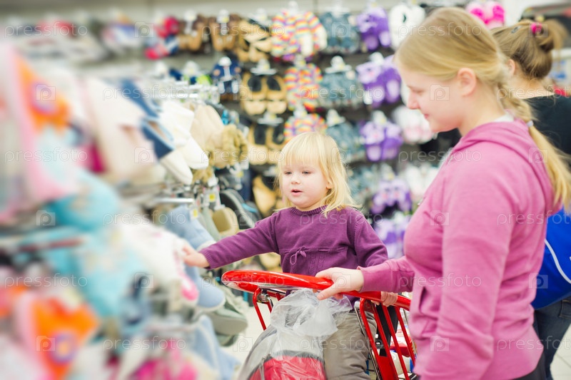 Мама с дочерью выбирают обувь в супермаркете