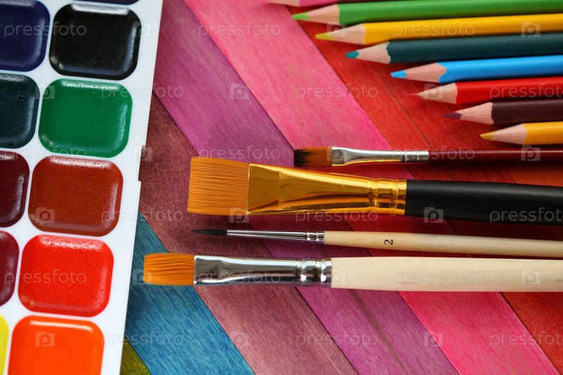Акварельные краски, кисти и цветные карандаши