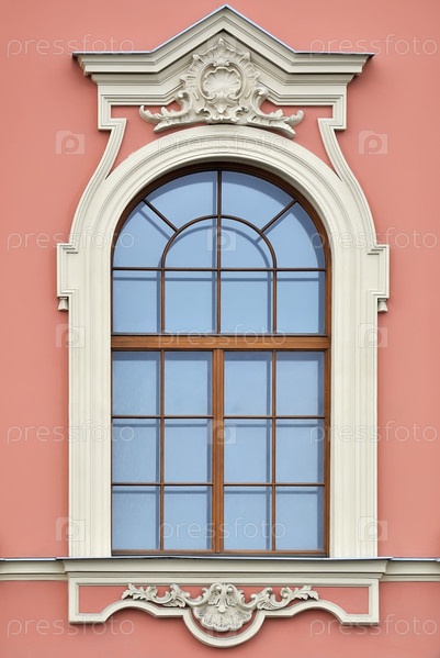 Окно с аркой и барельеф на фоне розовой стены. Окна Санкт-Петербурга