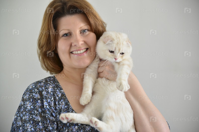 Шотландская вислоухая кошка в руках женщины