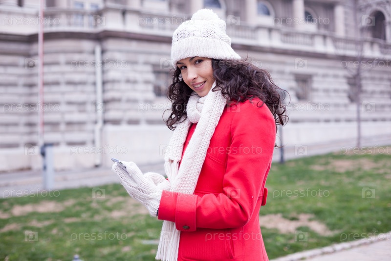 Женщина в красном Пальто со смартфоном