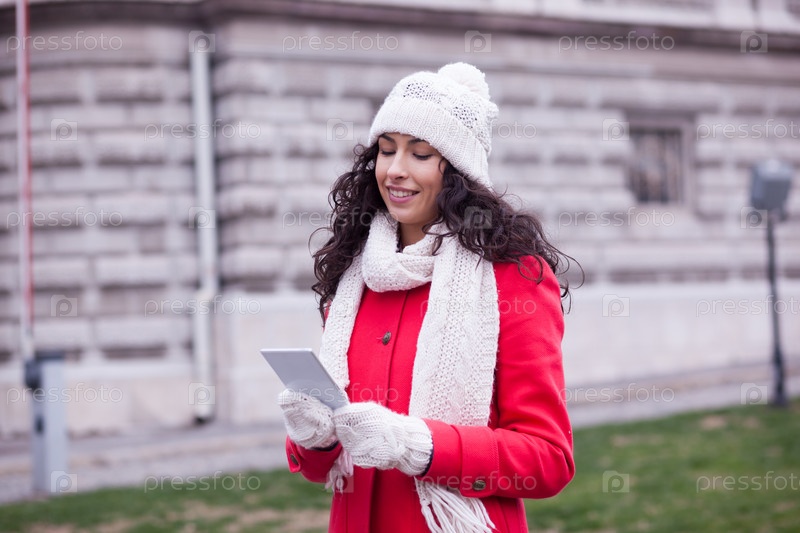 Женщина в красном Пальто со смартфоном