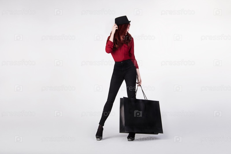 Молодая девушка с пакетом для покупок улыбается в шляпе