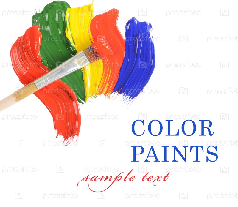 Кисть и разноцветные мазки краски на белом фоне с местом для текста
